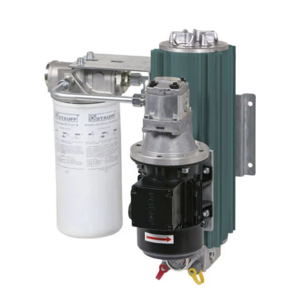 The unit draws oil from the reservoir via an integrated gear pump and directs it through the filter element. Stauff technology uses special spin-on elements that act as pre-filters, removing most of the water and larger contaminants. In a second stage, the fluid passes through the Stauff Micro Filter, where final removal of water and solid particles down to 0.5 micron takes place. This prevents the catalytic reaction between water and solid particles, ensuring extended oil service life.